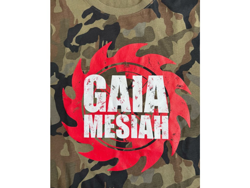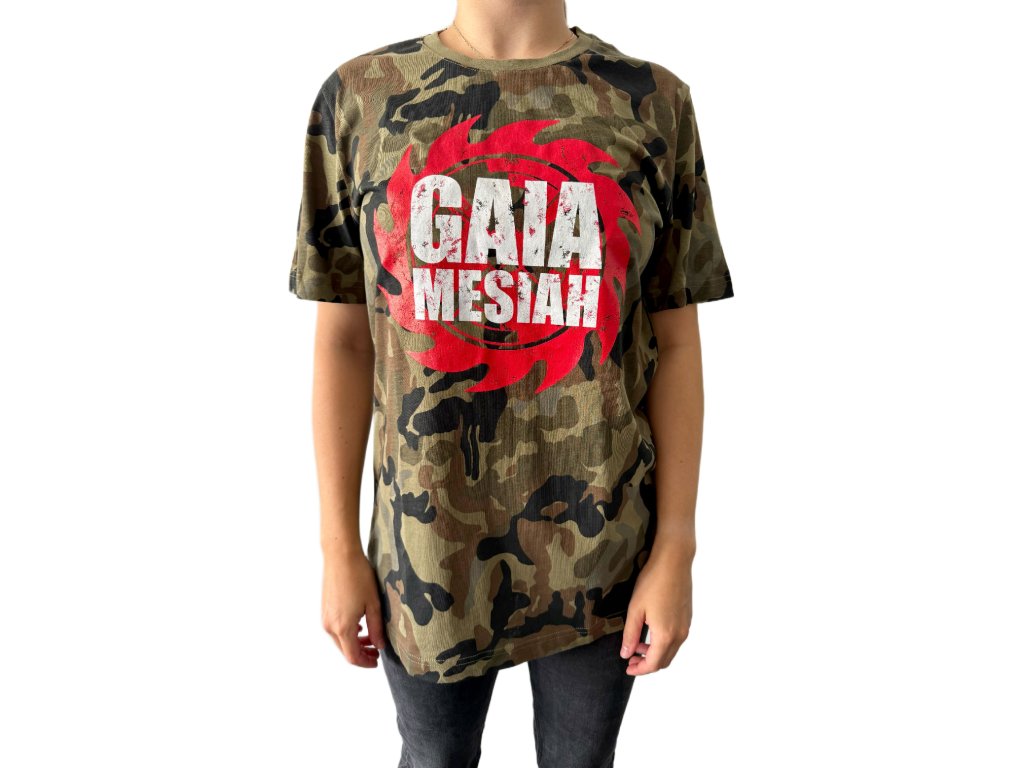 Camo styl s výbuchem loga GAIA MESIAH – rudý vír, co tě vcucne.